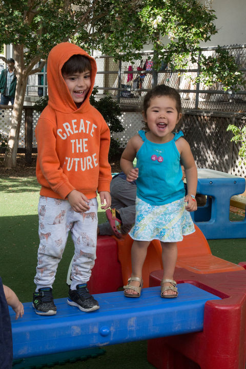 A carefully tended garden blooms between each tier of classrooms. Below the first tier, a path winds past rose bushes through a “butterfly garden” to a gazebo where children can gather for snacks. Below the path lies a manzanita “forest.” Small groups of children enjoy working in the preschool garden.