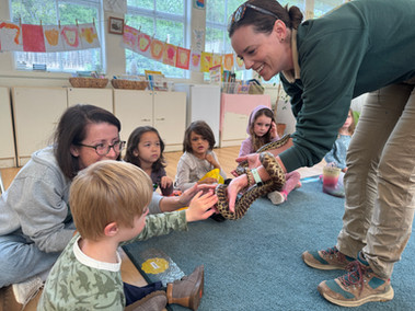 Meet Sidney the Snake and her human friend Jess, Meher School parent and alumna! Jess, a naturalist from East Bay Regional Parks District, visited some elementary classes this week to teach students about native animals and their habitats. In addition to getting to pet Sidney, students compared teeth of carnivores and herbivores, felt coyote fur, observed a taxidermy acorn woodpecker, and deepened their understandings of the natural world we live in.